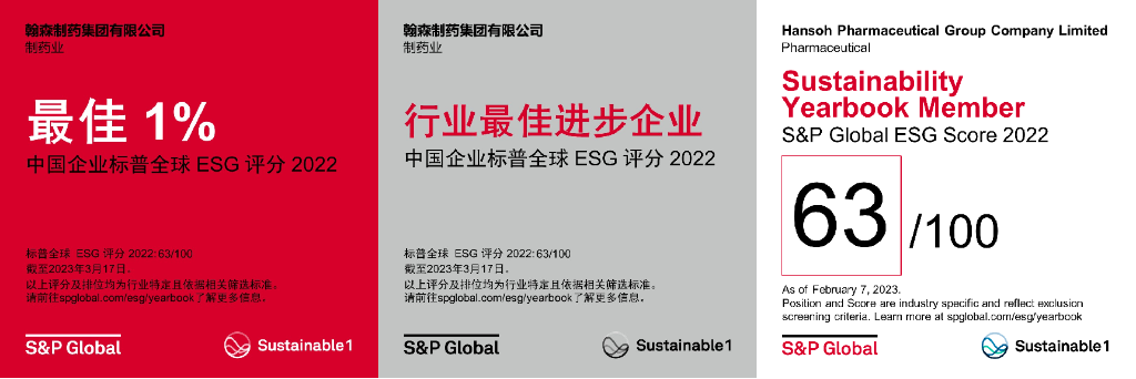 According to the assessments of the Sustainability Yearbook, these two achievements mean that Hansoh Pharma outperformed other Chinese pharmaceutical companies in terms of CSA score (63) in 2022, and made the biggest improvement in the sector. Hansoh Pharma was included in the S&P Sustainability Yearbook (Global) previously, and was the only pharmaceutical company in  Chinese Mainland to be selected.